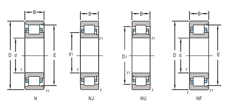 Die Zylinderrollenlager des Typs N haben zwei integrierte Flansche im Innenring und einen flanschlosen Außenring. Diese Art von Lager ist für hohe Radialbelastungen bei hohen Drehzahlen geeignet und erlaubt Axialverschiebungen in beide Richtungen enlang des Gehäuses relativ zum Schaft. Die Lager des NU Typs haben zwei Flansche am Außenring und einen flanschlosen Innenring. Sie können ebenfalls Axialverschiebungen standhalten (beide Richtungen entlang des Gehäuses relativ zum Schaft).